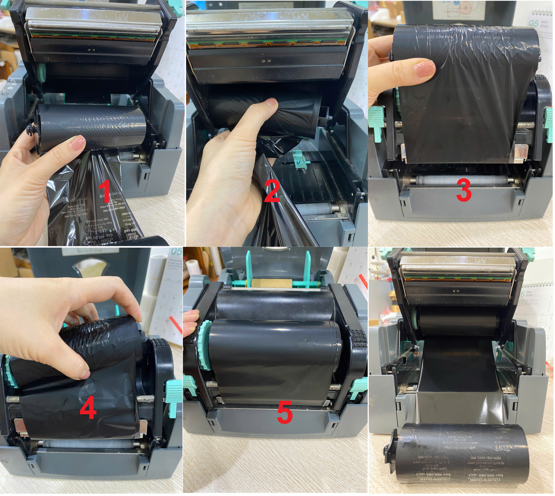 3. Lắp cuộn mực mới: Đặt cuộn mực mới lên trục mực theo hướng dẫn của máy. Đảm bảo cuộn mực khớp với các khớp lỗ hoặc ổ cắm.