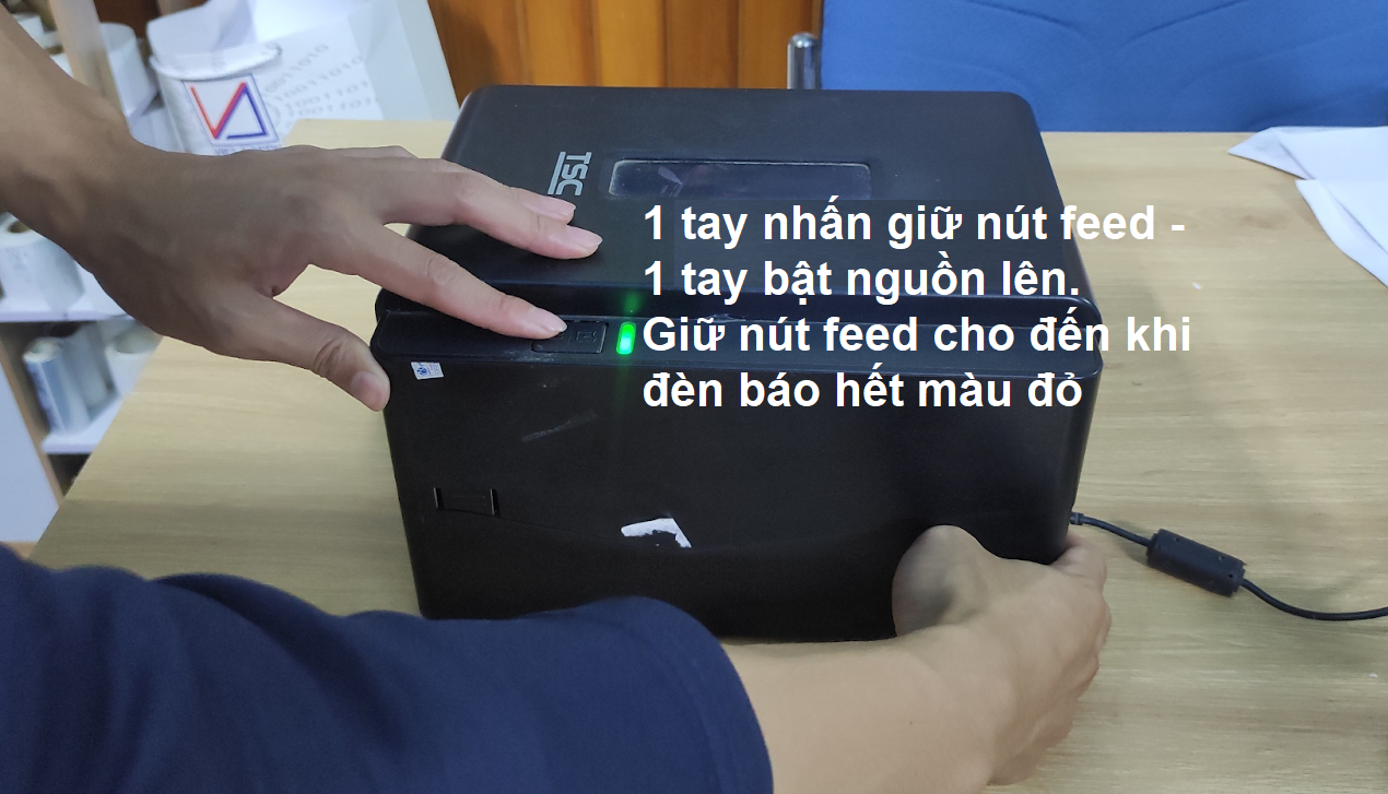 Bước 2: Nhấn và giữ nút feed nút ở phía trên nắp máy, đồng thời tay kia bật nguồn